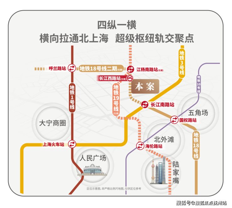 北上海轨交聚点 • 中环之上奢居新地标:地铁18号线横向拉通了原本纵向不相连的四线地铁:1/3/18/19,将北上海横向联通,成为区域轨交的交汇聚点;项目紧邻长江西路地铁站(直线距离约150米),1站江杨南路,5站复旦,7站五角场。