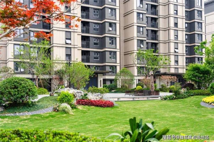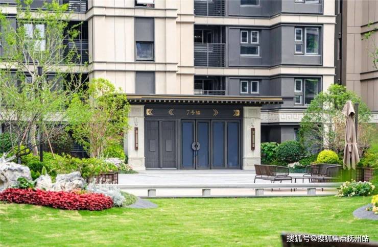 不像传统的单元门设计,观云府通过飞檐翘角搭配卡麦色石材回纹雕刻,金属线条与椽子的碰撞间,将传统礼制的庄重与现代审美的利落相融合,并且单元门两侧的景观也是定制的,入户红枫、四季桂等乔木、灌木精致搭配,归家仪式感十足。