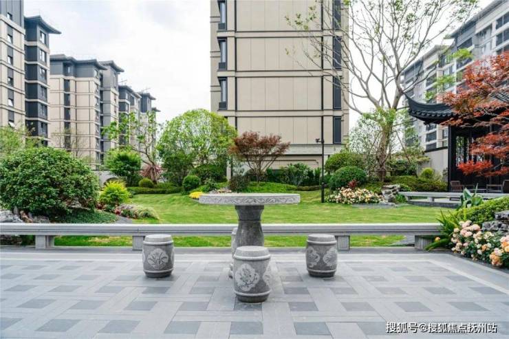 楼栋前的入口地面铺装,采用具有引导性中式线条,在石材地铺上还设置了一些可移动座凳、阳伞、花箱,让业主下楼即能在花香树影里与邻居闲话家常,或是独坐阳伞下读一本闲书,仪式感拉满!