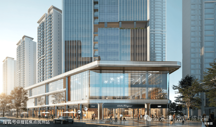 ▶以LOW-E玻璃+质感铝板+香槟金铝合金线脚玻璃幕墙形成现代美感外立面。
