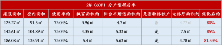 超高层产品亦有所突破。项目2号楼为60F超高层,通过飘窗、阳台、独立入户电梯厅赠送后优化得房率可达80%以上。