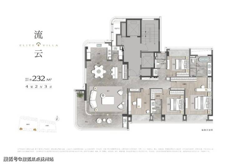 建面约232㎡四房两厅三卫:两梯一户设计,给予住户独一无二的尊崇归家礼序;南向L型转角阳台,视野范围可达270°,将城市景观转化为私有化“视觉资产”;四开间朝南,让阳光可以自由铺满居住空间的每一个角落。
