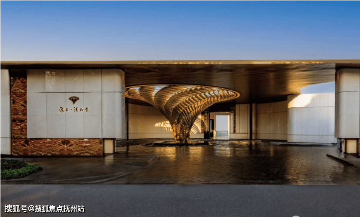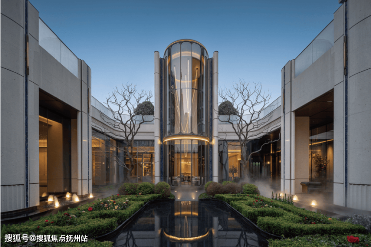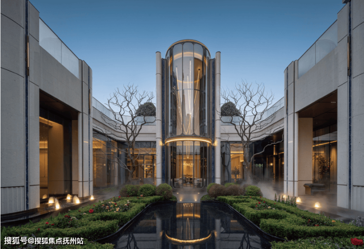 考究《周礼·考工记》古代规格定制“面阔九间”归家门庭,门庭外立面采用雅奢温润的建筑材料,辅以两侧具有仪式感的跳泉水景,共同构成了“贵雅清和”的城市界面。