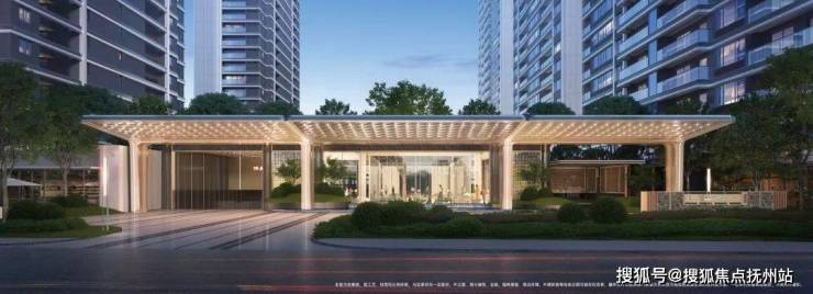 三面铝板立面,大面积玻璃运用,玻璃面连续长度大约9米;住宅顶部“悬浮云端”格栅塔冠设计,闪耀建筑的第五立面。约40米酒店式大门:以香港扎哈The Henderson为灵感来源,采用648块三角形宝石切割面打造矩阵高奢吊顶,规划高约5.6米,宽约40米的酒店式大门