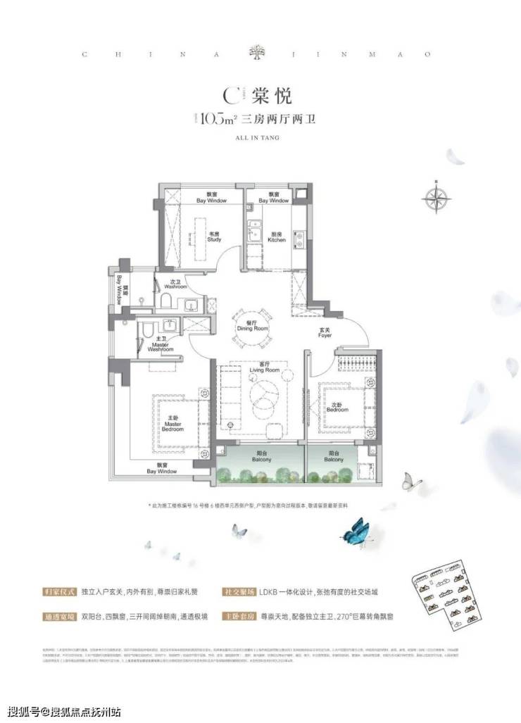 建面约105㎡3房2厅2卫,做到了三开间朝南+4个飘窗+双面阳台系统+主卧套房设计+270°转角飘窗,该户型的居住体验、舒适度、尺度感,是同级别产品所无法比拟的。
