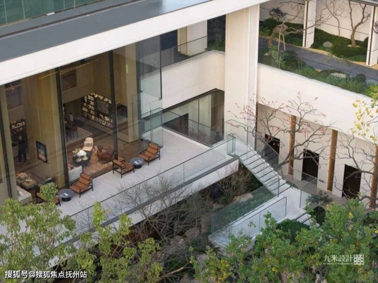 空间随之一转,步入光影交织的长廊,这里成为繁华城市与桃源生活的自然过渡。第二进为内部的地面花园,氛围安定,令人沉浸其中。继续向前穿过连廊,便抵达第三进——一处利用近8米高差打造的下沉式庭院。设计借意“九溪十八涧”,营造出九重水景:溪流、水潭、叠泉层层相续。置身院中,仿若步入一方微缩山水园林。