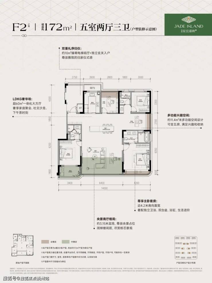 172㎡户型整体南向面宽达14米,其中主卧面宽约4.2米,餐客厅则是一个面宽约6.4米的南向大方厅,再结合3.15米的层高,开阔通透、大平层氛围十足。