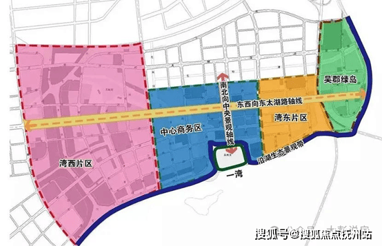 ·吴中太湖新城总体布局由“一湾、一带、两轴、四区”架构而成。