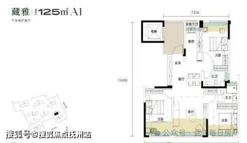 建面约125平单元拼接处户型:位于1号楼单元拼接处夹边户,三房两厅两卫,4个主要空间均带阳台+花池优化面积,三房设计,带独立电梯前室,结构相对比较常规。