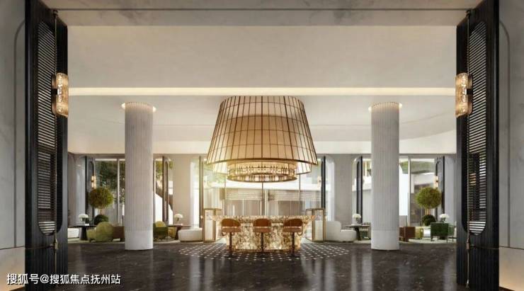 门楼高5.4米双层挑高大堂,396片阿根廷绿雕花叶片拼接出99朵花瓣背景墙,营造尊贵的归家仪式感。通过电梯往下走,来到中央车站,走出电梯厅映入眼帘的是圆形采光天幕,主背景墙面168块达芬奇米黄浮雕,由玉石、金属层叠组成,发出暗暗荧光。本项目将弧线用到极致,处处尽显柔和之美。