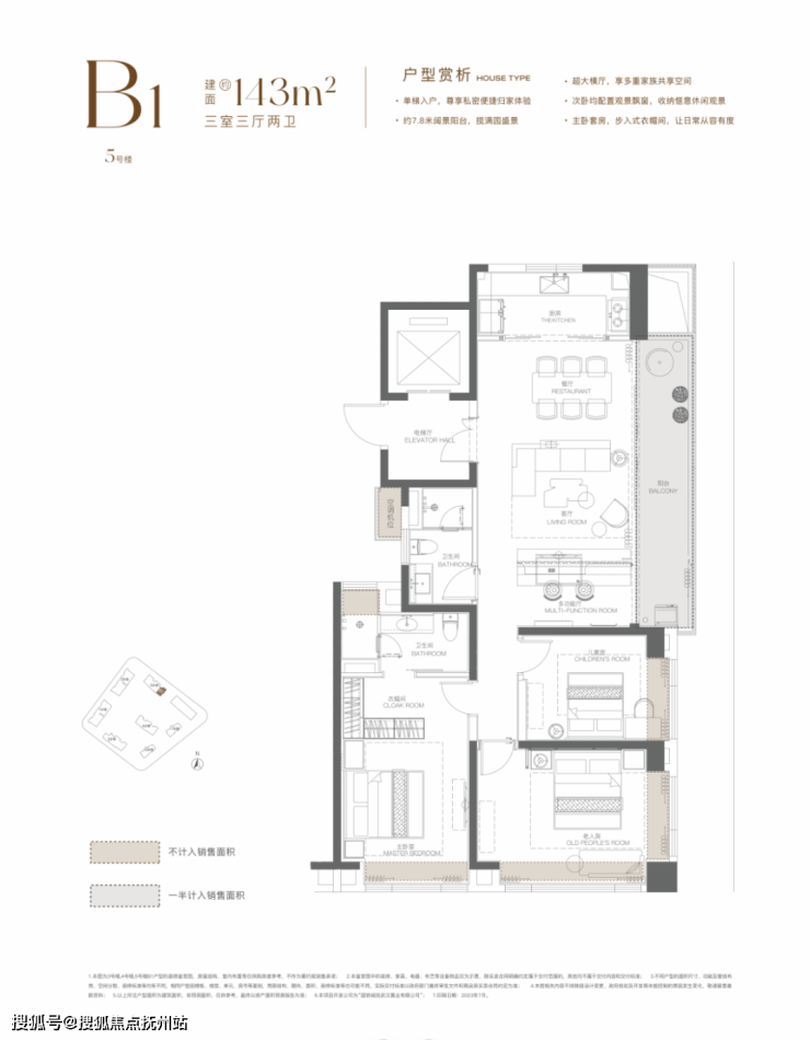 建面约143平,三房两厅两卫: