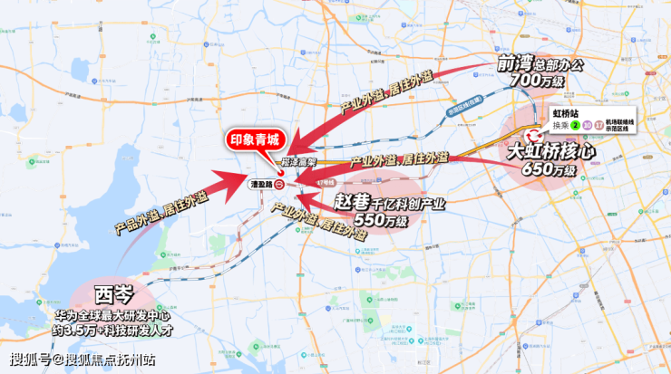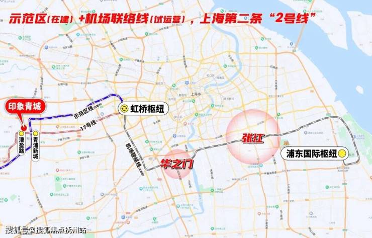 但这还不是全部,17号线+示范区线(在建)左手长三角一体化、华为,右手前湾、大虹桥总部商办,并通过虹桥枢纽,串联2号线及正在试运营的机场联络线,把市中心、徐汇、闵行、张江等高能板块都纳入印象青城的通勤版图。