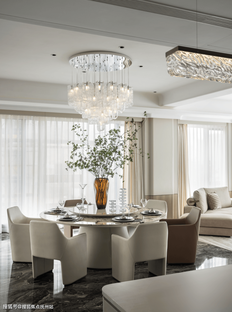 餐厅与客厅空间相贯连,开阔的视野带来惬意与更具互动感的用餐氛围。法国餐具品牌Christofle的精巧工艺与大理石水墨画般的自然纹理交相叠映,镜面光泽,熠熠生辉,每一处细节都彰显着对品质生活的极致追求。