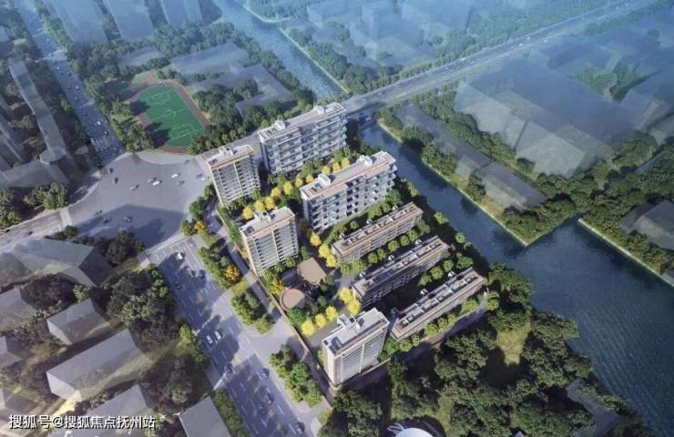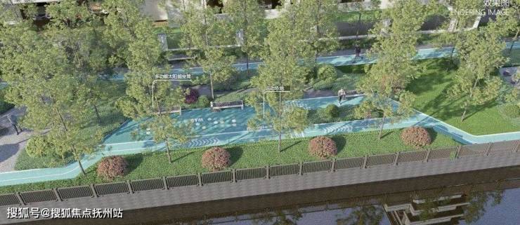 除了内部景观外,项目还借景古塘河,为业主打造约2600㎡水岸公园,含水杉树阵、绿地草坪、400米跑道及健身设施等。