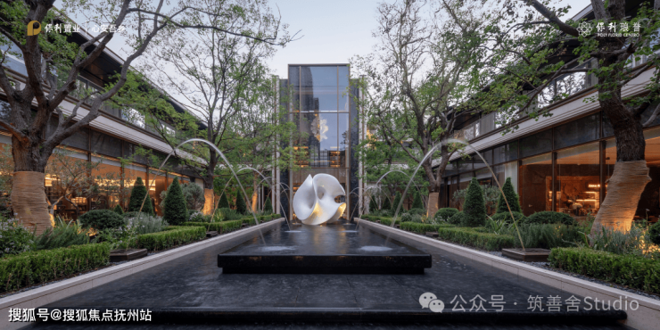 白色雕塑以花为灵感,命名为《未央》,静雅柔美。周围环绕着修剪整齐的欧式灌木、对称的水景仪仗队和两侧高大的乌桕树。无论是春夏的青翠,还是秋冬的红艳,都带来深深的治愈感。