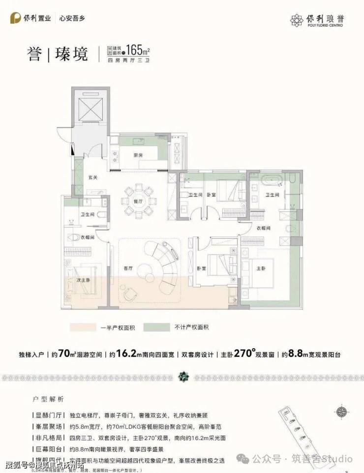 建筑面积约165㎡户型,独立电梯厅,双玄关巧妙布局,第一重迎宾玄关彰显尊贵,第二重家庭玄关收纳日常,功能与仪式在此完美交融。约70㎡LDKG空间,兼具沙龙与宴聚功能,约8.8米观景阳台,将城市风光尽收眼底,延伸生活视野与想象,静候每一次与世界的从容对话。约16.2米四面宽设计,让每个主要房间都沐浴阳光。双套房设计贴心入微,既保障家庭成员的独立隐私,又维系家人间的亲密互动。
