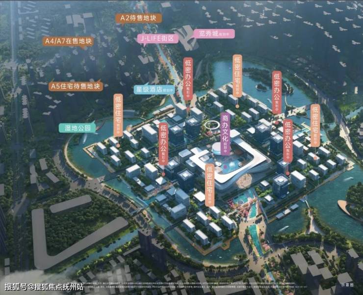 分岛内岛外两大部分:岛外规划有绿色住宅,览秀城,五星级酒店,方岛示范商业街区等城市标杆级商业配套;岛内规划以四大文化场馆、低密商办、低密住宅等组成,旨在打造成绿色生态、低碳能源绿色社区。