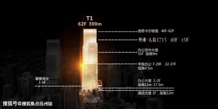 T1 -300米超高层塔楼上部46-62层为五星级酒店(丽思卡尔顿)、38,40-45层行政公馆,中部7-37层为甲级办公,底部为商业及大堂。