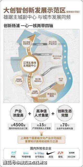 江湾五角场和新江湾城共同构建了大创智创新发展示范区。形成了世界级的产业集群,是"产业浓度、人才浓度、创新生态"兼具的创新功能聚集区。