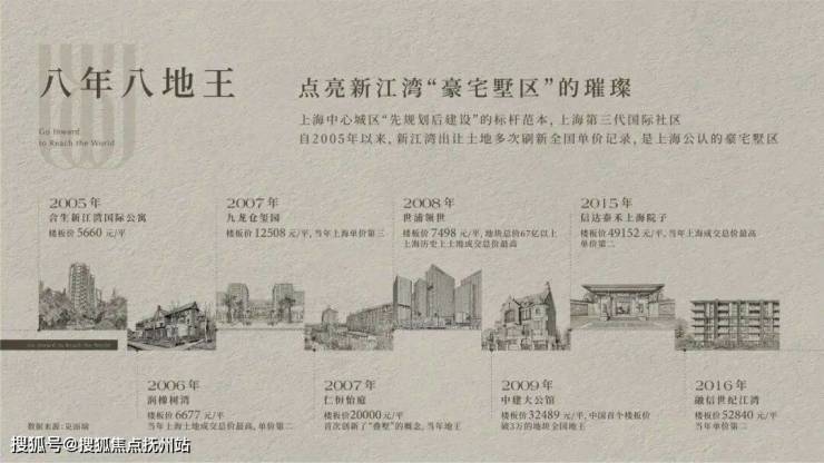 自2005年以来,新江湾城出让的土地多次刷新全国单价纪录,像项目旁边的中建大公馆的2009年的拿地价为32,484元/平方米,作为首个地价突破3万的项目,创下当时全国土地单价纪录。