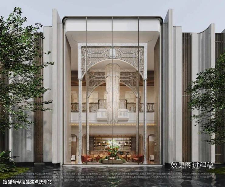 立面上,甄选古铜不锈钢、超白玻璃、天然奢石等高端材质,外立面以米白贝金石、古铜金属、法式蓝灰玻璃构成低饱和度高级色系,质感通透且历久弥新