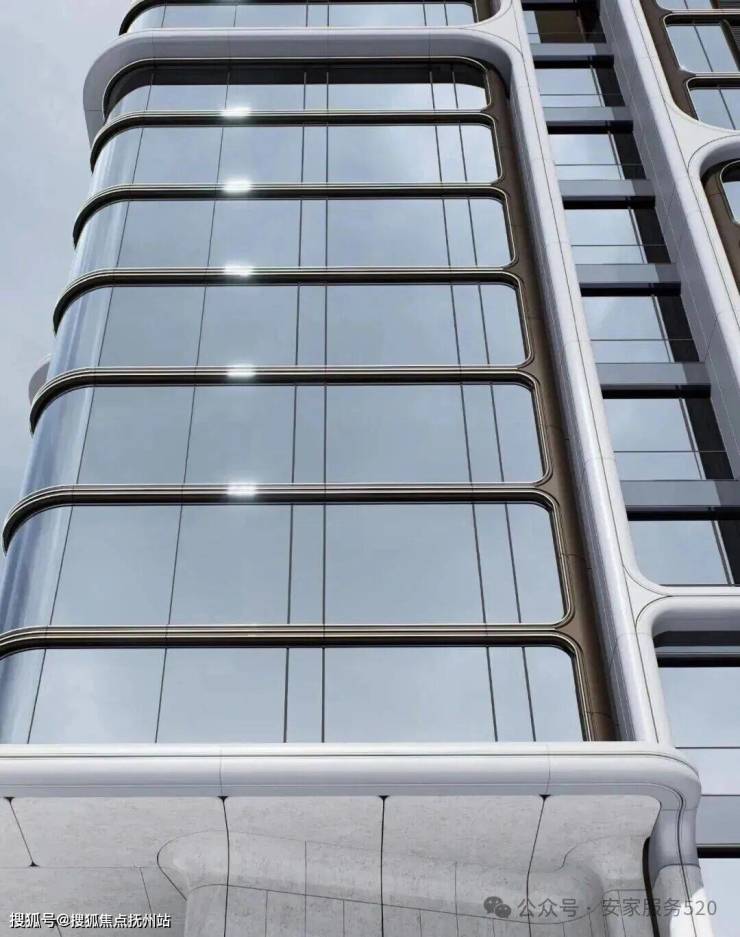 建筑立面采用全景玻璃幕墙与弧形铝板相结合,勾勒出流畅的流体几何造型。