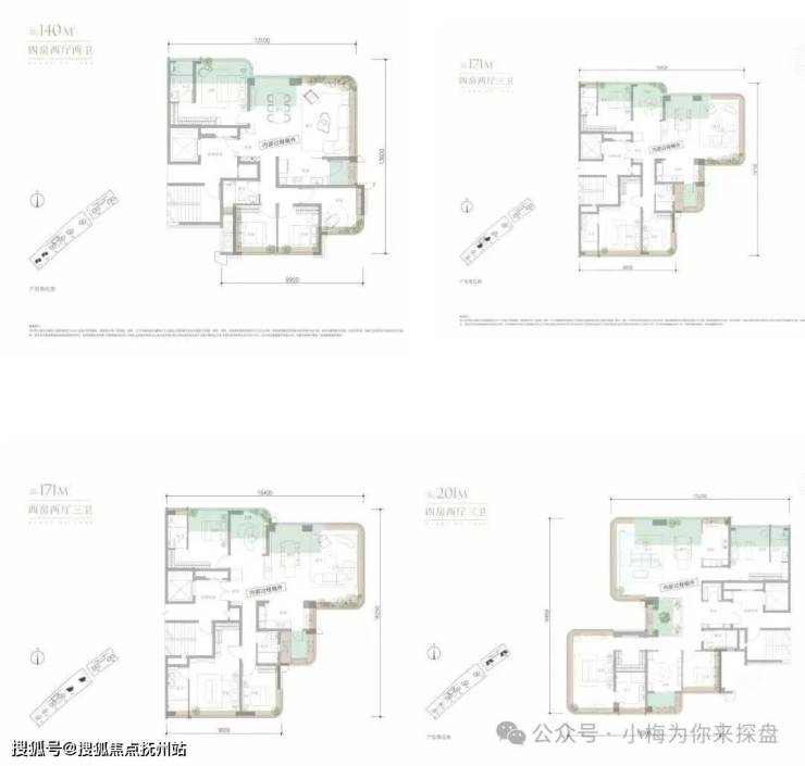 该项目的外立面,是公建化外立面,做了香槟金色的弧形线条,采用了大全景玻璃,颜值也是很高。从效果图来看,预计是封窗交付。该项目小梅了解到该户型面积段主要包含3个,140㎡、171㎡以及201㎡左右,其中主力户型是170㎡左右。户型图如下