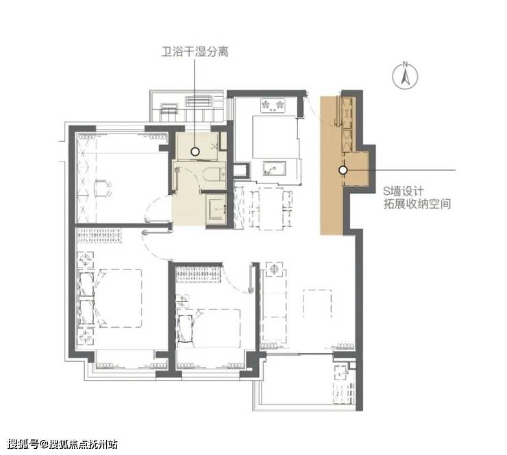 更值得一提的是建筑面积约89平方米户型“S墙创新设计”,为相邻两户创造出了额外的凹槽空间,扩展了收纳。将冰箱塞入这个凹槽,释放厨房的冰箱空间,延伸灶台面积,或者可以做岛台……让小户型不在受收纳空间的支配;