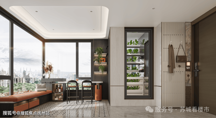 这种入户厅在其他项目是做外部玄关,但在这里是有大面积玻璃采光,12㎡空间直接升级为入户光厅+4㎡空中菜园,或天空书房茶室等,让归家的仪式感与生活的情趣完美融合。