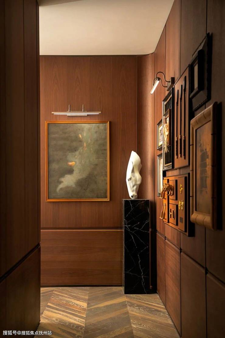 十字玄关转过,动静分区,这里可以注意,为了消除长过道的逼仄感,拓展出节点过厅,用以展陈艺术。