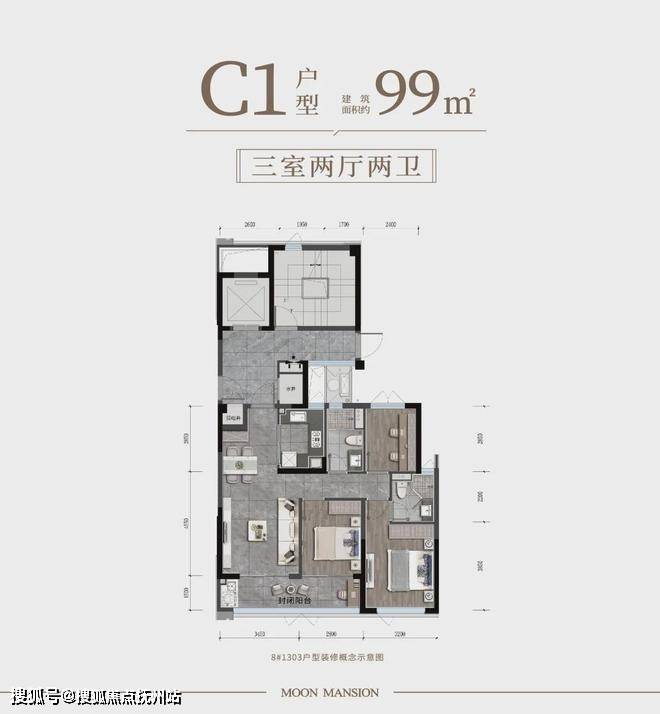 建筑面积约99m²C户型,奢侈给出双联阳台,大尺度观景视野,超广视角美如画,打通了自然与人的隔膜,把阳光、清风、满园景色全部引进来,使室内外空间界限进一步消融,窗外景色沉浸式入目!