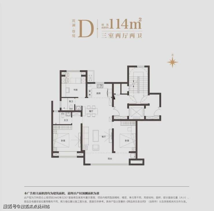 建面约114㎡三房两厅两卫,则是一个全明通透的户型,厨房连接餐厅、客厅和阳台,实现了南北通透,整体格局大气。