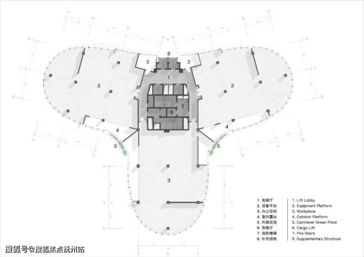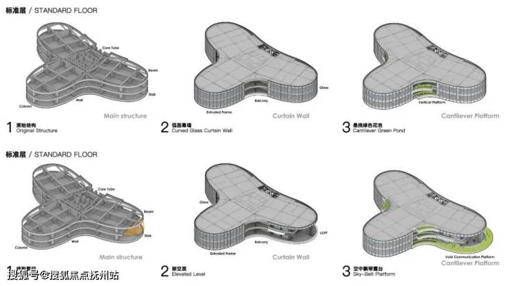 审查原始图纸时,我们发现塔楼原有设备平台丑陋的出挑于主干道方向,且受制于《城市规划条例》的变更,又无法拆除或并入计容空间内。如果藏不住,那就让它show出来,其也成为空中花园的结构雏形,绿化点缀于轮廓弧度转折点,打断过于冗长的玻璃幕墙,同时掩盖了城市的喧嚣,创造出和平宁静的空间氛围。