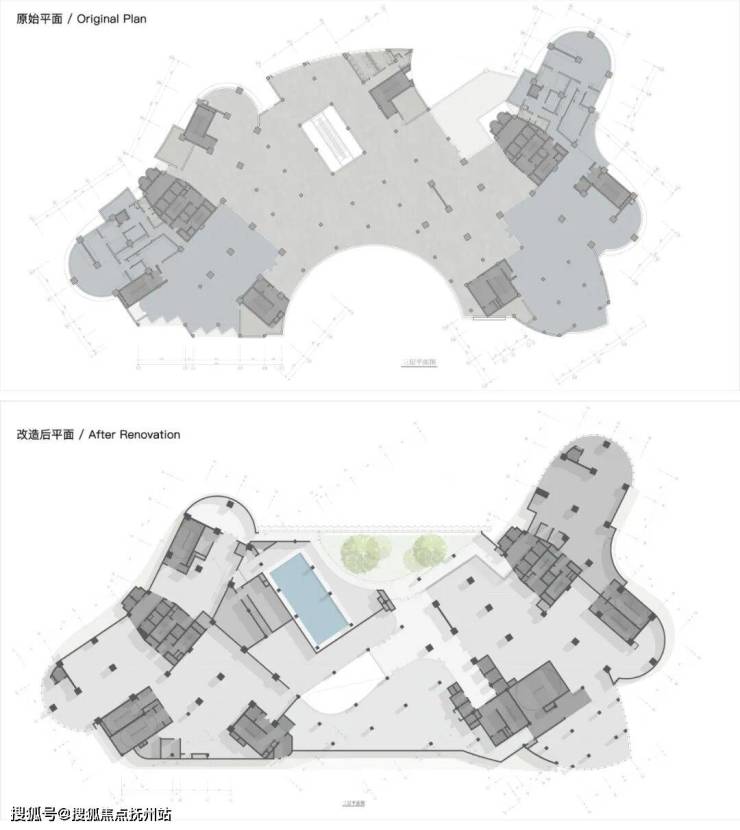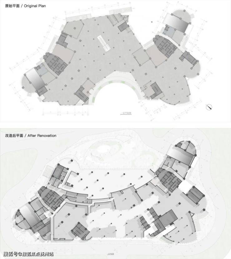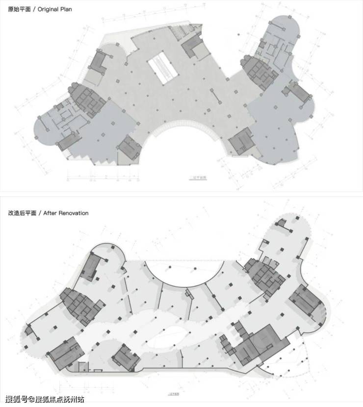 原建筑为纯办公属性,故原布局在南侧设置有内凹的集合广场,改造则引入了全新的使用需求——社区商业。新功能为总图布局提出了改造需求,商业需要开阔的沿街展示面和外摆空间,并面向主城市界面。而办公区则需要相对私密的空间流线和便捷的车库出入,同时业主还希望为其打造一个独立私密花园以区别于周边的普通写字楼。在和甲方/施工图院/结构工程师多次交流后,设计采用“腾龙换鸟”的策略,沿塔楼主体找结构梁,拆除北侧突出裙楼,将折损的面积全部补回南侧,填平内凹广场。
