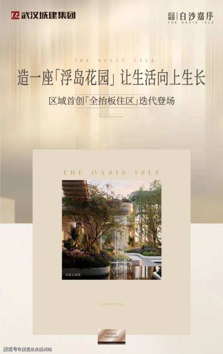 武汉城建·白沙嘉序采用全抬板抬高设计,整体抬升高度约5米,以“浮岛花园”为主题,通过立体空间、生态艺术与多功能分区的巧妙融合,打造兼具未来感与艺术性的高端社区。
