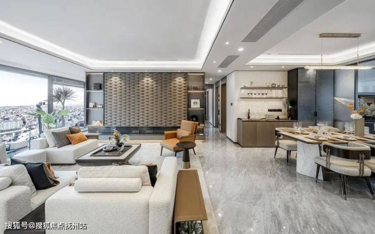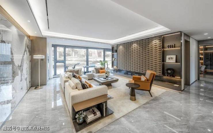 6.1 米挑高入户大堂:岩板背景墙搭配防眩光灯光,地下精装大堂融合金属线条,出入皆享酒店式尊崇,让归家成为身份的彰显。