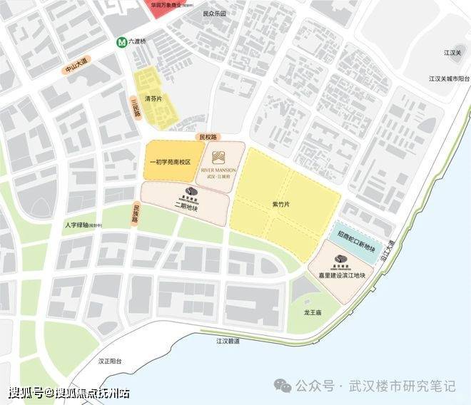 区位来看,这两个项目处于武汉内环,长江与汉江交汇处。西边是汉口起源点龙王庙,东边是华中第一步行街江汉路,与南岸嘴、长江大桥黄鹤楼隔江相望,其地段价值毋庸置疑。