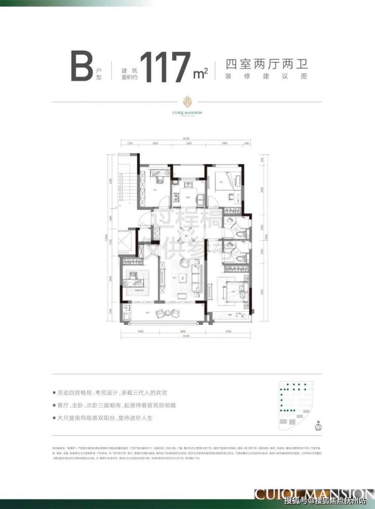 因为洋房天然的得房率优势和滨江的空间设计能力,翠栖府的户型得房率近90%,面积横跨建面约97~139㎡,基本都没有浪费空间,套内实用面积远超板块同级高层产品。