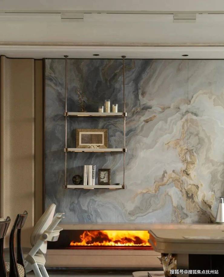 材质与工艺上,100户型的背景墙选用幻日流光岩板,看上去就有一股低调的奢华。
