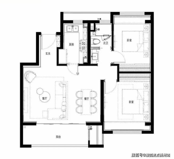 建面约83㎡的洋房户型,迎合了目前市场的主流,做到5.8米大面宽横厅,客餐厅一体化的设计,连接宽景大阳台。同时一南一北两间卧室,均带有飘窗,采光进一步延伸。干湿分离设计,更加科学高效。