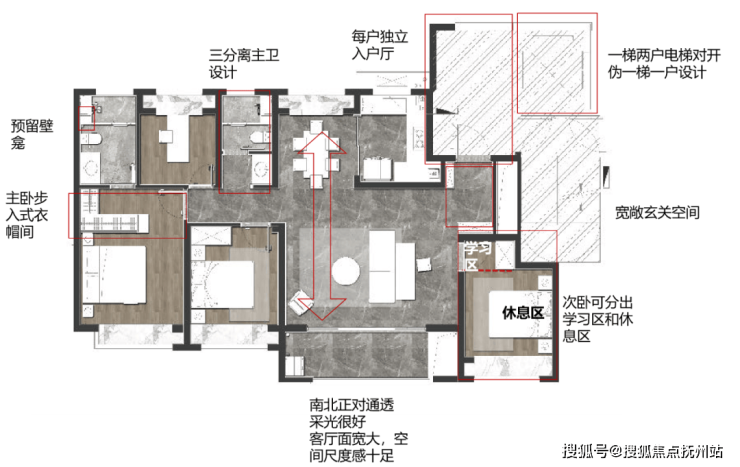 4个房间中3个都是南向,主卧更是做出了步入式衣帽间,豪宅感十足,其余3个房间也足够宽敞明亮,非常适合3代同堂的生活模式