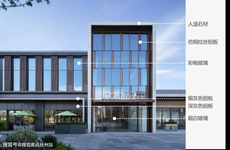 在材料的选择上,都易的建筑师继续保持着对石材的经典感和现代材料的科技感之间的平衡,比如对石材的选择呼应了前期示范区的主色调及整个都会大盘的环境;仿铜铝板的使用则突出了项目作为社区中心的温馨、充满活力的氛围;银灰色铝板、超白玻璃、以及彩釉玻璃的使用则强调了项目的现代时尚感。
