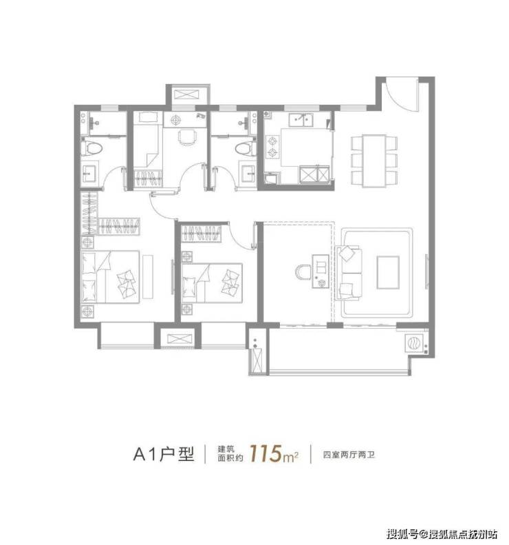 这个约115㎡的4房2厅2卫户型,是目前来看,临港改善户型中更具性价比的一个。