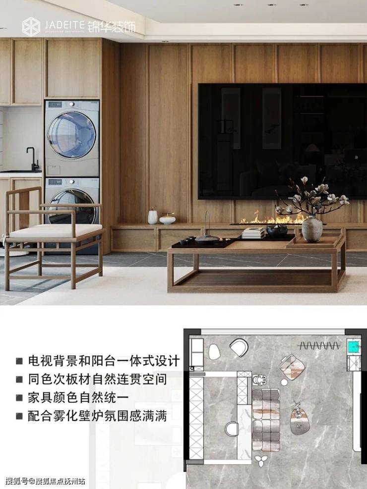 ②客厅借用了次卧一半空间后更显开阔,电视背景与阳台以同色系板材自然衔接,茶几、休闲椅也选用了统一色调的实木材质,配合雾化壁炉,温馨感满满。