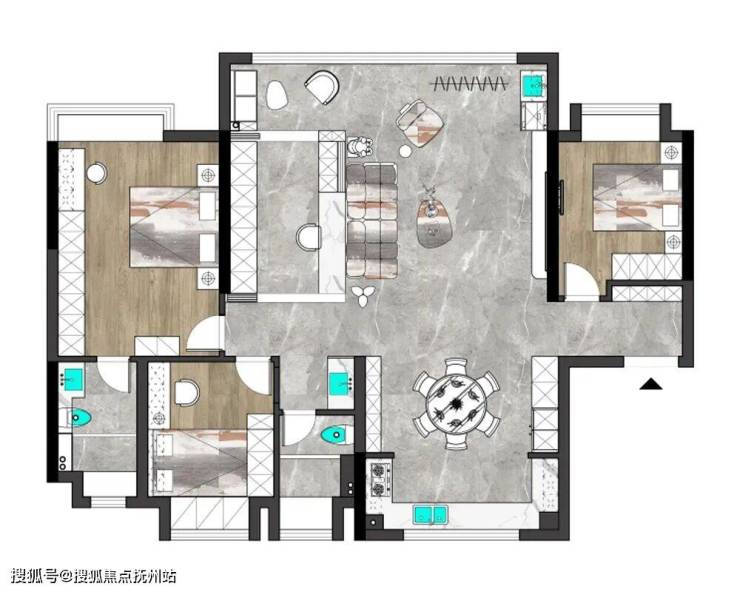 在材料选用方面,本案以木饰面为全屋背景,温润的质感为空间注入了高雅的格调。搭配实木茶几、餐桌椅,为空间增添了一份厚重质感。沙发选用布艺材质,给予人温暖的包裹感,地面深色地砖通铺,奠定了空间大气沉稳的基调。