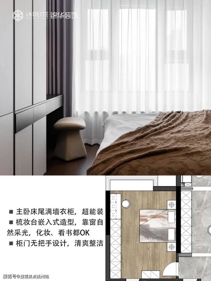 ④主卧床尾满墙衣柜+嵌入式梳妆台,为业主直接省下一个衣帽间。