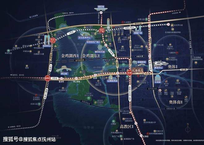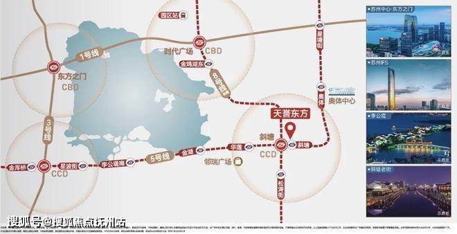 双轨交汇 黄金四角环湖四轨交汇,缔造金鸡湖黄金四角,西北-东方之门、东北-时代广场、西南-李公堤、东南斜塘老街一黄金四角所在核芯价值所向。