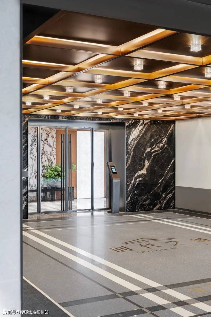 用料上,部分以冰火板+岩板打造的车行道廊柱、仿透光云石定制车牌号、部分主干道全铝板吊顶,无不显示出业主的归家气场。