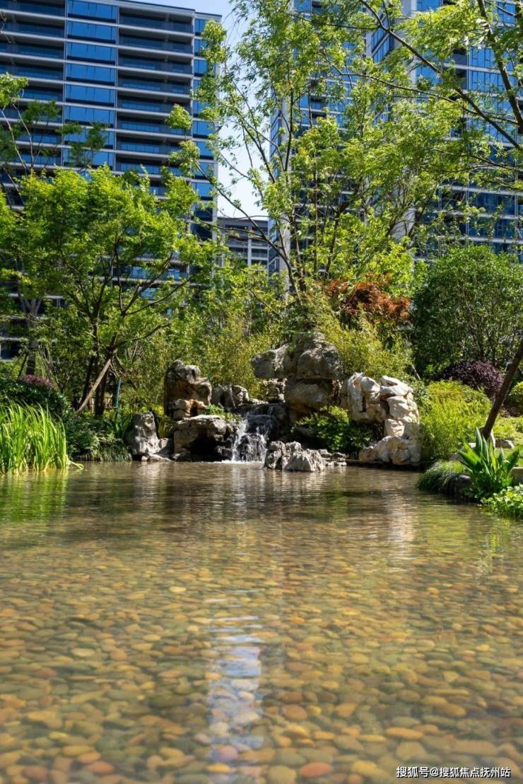 大面积的水景,铺面鹅卵石的湖底,错落的叠石,细碎的湖边草,在天光的映射下,呈现自然、清新的状态。