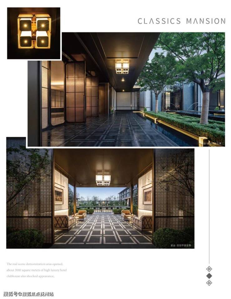 车马院以上海半岛酒店作为灵感来源,在设计方面采用了海鸥丽晶酒店同款的接待门,凸显出尊贵的大家门厅风范;营造社区归家的玄关,下挂式的星空顶、艺术雕塑、迎宾叠水以及范思哲黑背景墙相互映衬。